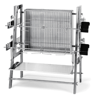 Ce modèle est facilement transportable, il est la solution idéale pour la cuisson de toutes pièces de viandes. Contrairement aux tournebroches horizontaux, la mise en place de la pièce à griller ne nécessite aucun équilibrage. Un petit moteur suffit à faire tourner de gros morceaux de viande (Poulets, Dinde, Jambon à l'os, ...).